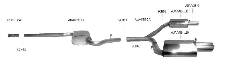 VW alleine montiert werden. Bei allen anderen Modellen können die Endschalldämpfer nur unter Verwendung des Y-Verbindungsrohr AUA4/8E-2A und dem Adapter Endschalldämpfer auf Serie A63-
