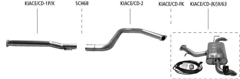 Die Endschalldämpfer können auch alleine montiert werden. Zur Montage benötigt man zusätzlich den Adapter A63-...VW, den Adapter KIACE/CD-AD und das Befestigungskit KIACE/CD-FK!