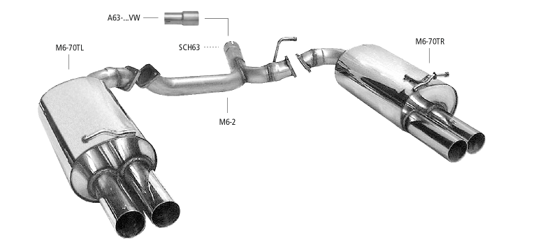 Bei Fahrzeugen mit original einem Endschalldämpfer kann entweder der Endschalldämpfer RH alleine montiert werden oder es können die Endschalldämpfer LH + RH unter Verwendung des Verbindungsrohrs M6-2 und dem Adapter Verbindungsrohr auf Serie A63-...VW montiert werden. Zur Befestigung des Endschalldämpfers LH wird der original Aufhängegummi BP47-40-061A benötigt.