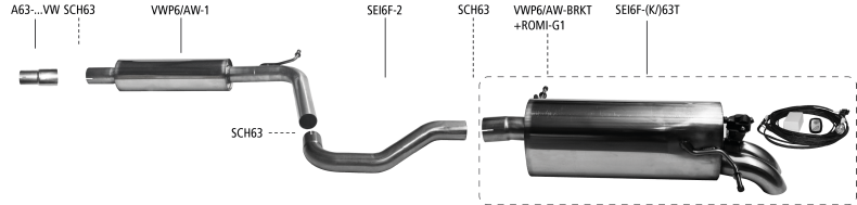 Der Endschalldämpfer kann auch alleine montiert werden. Zur Montage des Endschalldämpfers benötigt man neben dem Adapter A63-...VW zusätzlich 1x das Verbindungsrohr SEI6F-2, 1x den Halter VWP6/AW-BRKT und 1x den Aufhängegummi ROMI-G1.
