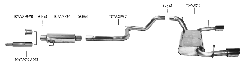 können auch alleine montiert werden. Zur Montage der Endschalldämpfer benötigt man neben dem Verbindungsrohr TOYA/XP9-AD1 zusätzlich 1x den Halter TOYA/XP9-BRKT und 1x den Aufhängegummi ROMI-G1. Bei Yaris TS Modellen wird empfohlen, den Heckschürzenansatz TOYA/XP9-HE1 bei Montage des Endschalldämpfers mit Einfach-Endrohr LH + RH, Art-Nr. TOYA/XP9-Q90I, mit zu verwenden. Es ist auch möglich, den Heckschürzenansatz TOYA/XP9-HE1 bei allen anderen Modellen zu montieren. Jedoch muss vor Montage des Heckschürzenansatzes erst die Heckschürze des TS-Modells, Orig. Teile-Nr. 52159-52931, am Fahrzeug montiert werden.