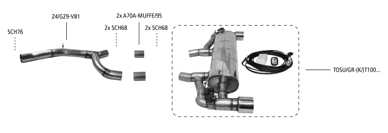 Bei 3.0l Modellen kann nur der Endschalldämpfer alleine montiert werden. Zur Montage des Endschalldämpfers TOSU/GR-(K/)T100... werden 2x die Verbindungsmuffe A70A-MUFFE/95 und 4x die Auspuffschelle SCH68 benötigt!