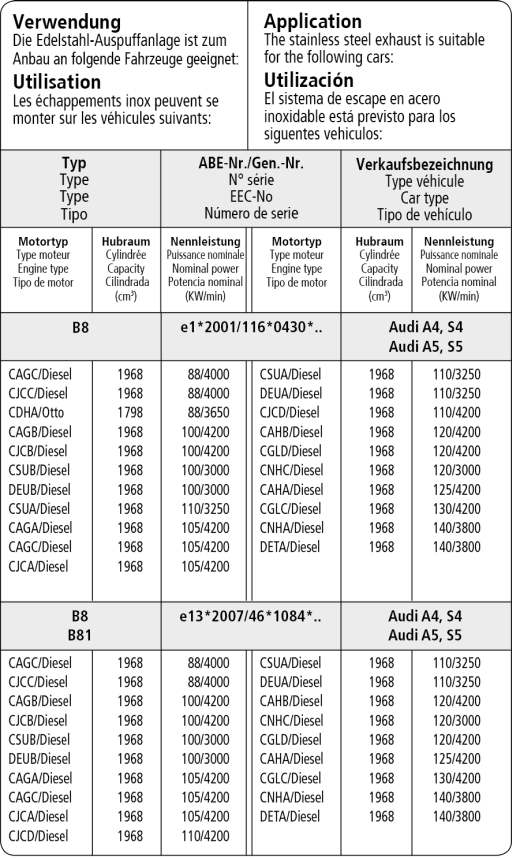 - A4/A5 B8 (ab B. 2008) 4 Zyl. Diesel 2 Endschalldämpfer LH+RH außer A5 B8 Sportback
