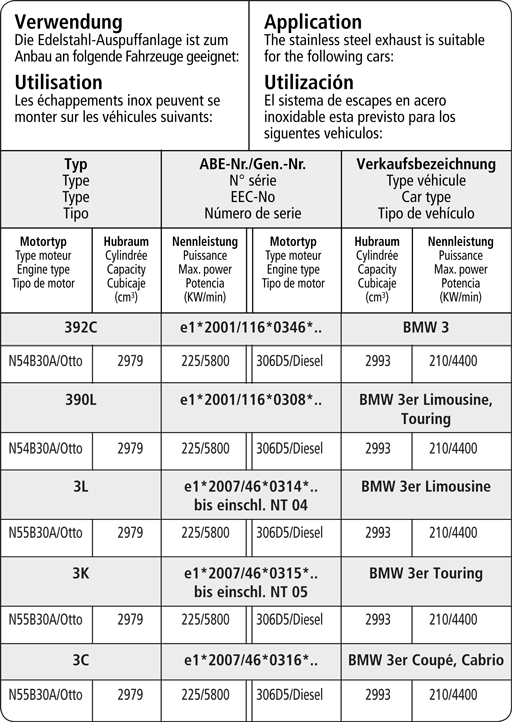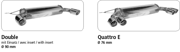 Bei Verwendung des Endschalldämpfers mit Doppel-Endrohr 2x Ø 76 mm LH + RH, Art-Nr. BMWE92-Q76E wird empfohlen den Heckschürzenansatz BMWE90-HE2 mit zu verwenden!