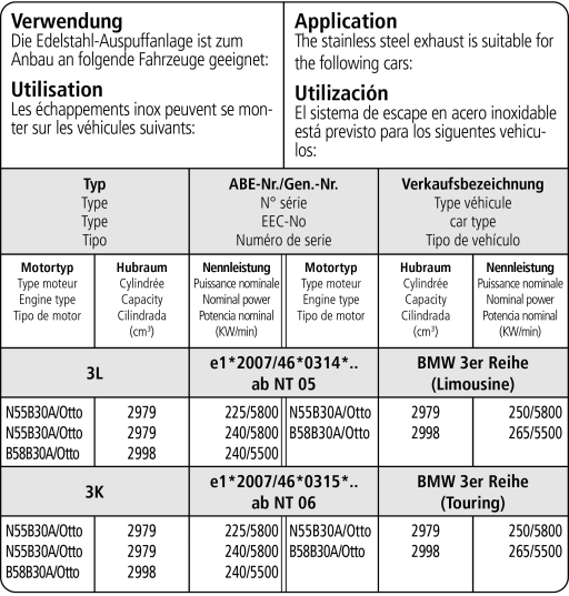 Bei Fahrzeugen, die serienmäßig eine M-Heckschürze haben, wird bei Montage des Endschalldämpfers BMWF30-Q85TR oder BMWF30-K/Q85TR/C empfohlen, den Heckschürzeneinsatz BMWF32-HE1 mit zu verwenden.