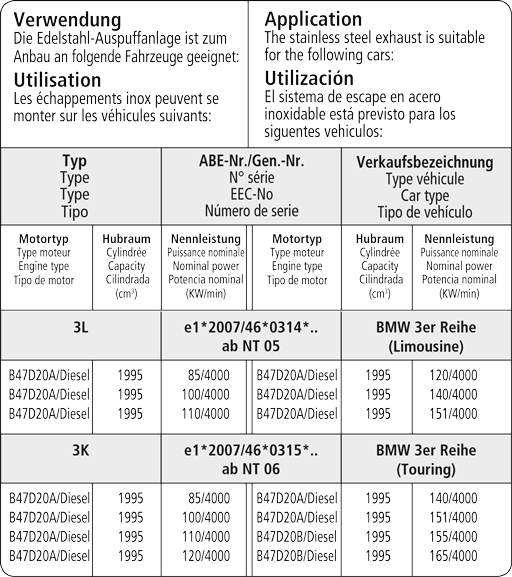 Bei Diesel Modellen kann nur der Endschalldämpfer alleine montiert werden. Zur Montage des Endschalldämpfers werden das Verbindungsrohrs BMWF30-AD60.5 (beim 4 Zyl. Diesel) und die Halter BMWF30-BRKT1 (RH) und BMWF31-BRKT2 (LH) benötigt. Eine Montage des ESD BMWF30-Q85TR ist bei Fzg. mit automatischer Heckklappenbetätigung und ausklappbarer Anhängerkupplung nicht möglich.