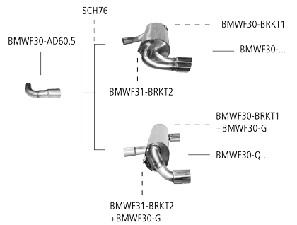 Bei Diesel Modellen kann nur der Endschalldämpfer alleine montiert werden. Zur Montage des Endschalldämpfers werden das Verbindungsrohrs BMWF30-AD60.5 (beim 4 Zyl. Diesel) und die Halter BMWF30-BRKT1 (RH) und BMWF31-BRKT2 (LH) benötigt. Eine Montage des ESD BMWF30-Q85TR ist bei Fzg. mit automatischer Heckklappenbetätigung und ausklappbarer Anhängerkupplung nicht möglich.