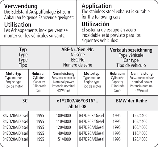 Bei Diesel Modellen kann nur der Endschalldämpfer alleine montiert werden. Zur Montage des Endschalldämpfers werden das Verbindungsrohrs BMWF30-AD60.5 (beim 4 Zyl. Diesel) und die Halter BMWF30-BRKT1 (RH) und BMWF31-BRKT2 (LH) benötigt. Eine Montage des ESD BMWF30-Q85TR ist bei Fzg. mit automatischer Heckklappenbetätigung und ausklappbarer Anhängerkupplung nicht möglich.