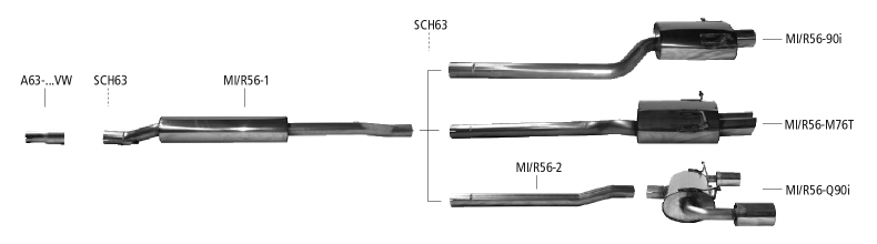Zur Montage des Endschalldämpfers MI/R56-Q90i mit Einfach-Endrohr 90 mm Ausgang LH + RH oder des Endschalldämpfers MI/R56-M76T mit Doppel-Endrohr 76 mm Ausgang mittig benötigt man noch zusätzlich den Befestigungssatz MI/R56-BRKT und den Aufhängegummi ROMI-G1. Der Endschalldämpfer kann auch alleine montiert werden. Zur Montage des Endschalldämpfers benötigt man 1x den Adapter A63-...VW und bei Verwendung des Endschalldämpfers MI/R56-Q90i mit Einfach-Endrohr 90 mm LH + RH neben dem Adapter A63-...VW noch zusätzlich 1x das Verbindungsrohr MI/R56-2. Bei Montage des Endschalldämpfers MI/R56-Q90I mit Einfach-Endrohr 1x 90 mm LH+RH wird empfohlen, den Heckschürzeneinsatz MI/R56-HE2 (Mini One/Cooper/ Diesel außer Facelift) bzw. den Heckschürzenansatz MI/R56-F/HE2 (Mini One/Cooper/ Diesel Facelift) u. bei Montage des Endschalld. MI/R56-M76T mit Doppel-Endrohr 2x 76 mm Mitte, den Heckschürzeneinsatz MI/R56-HE3 (Mini One/Cooper/ Diesel außer Facelift) bzw. den Heckschürzenansatz MI/R56-F/HE3 (Mini One/Cooper/ Diesel Facelift) mit zu verwenden.