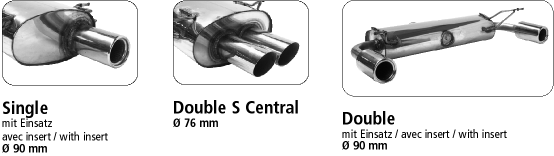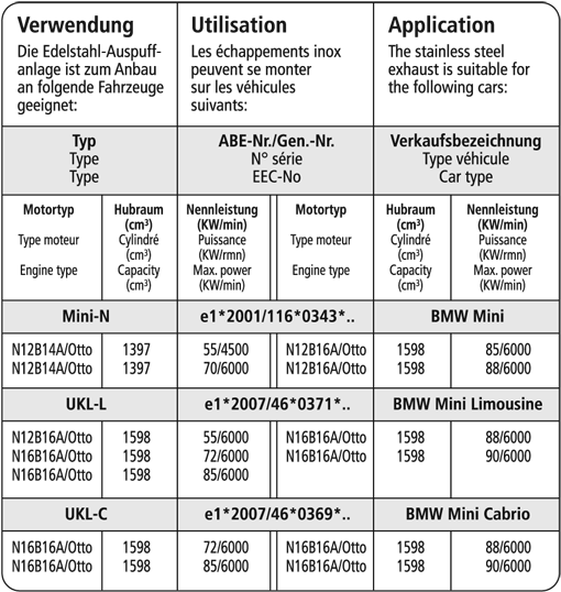 Zur Montage des Endschalldämpfers MI/R56-Q90i mit Einfach-Endrohr 90 mm Ausgang LH + RH oder des Endschalldämpfers MI/R56-M76T mit Doppel-Endrohr 76 mm Ausgang mittig benötigt man noch zusätzlich den Befestigungssatz MI/R56-BRKT und den Aufhängegummi ROMI-G1. Der Endschalldämpfer kann auch alleine montiert werden. Zur Montage des Endschalldämpfers benötigt man 1x den Adapter A63-...VW und bei Verwendung des Endschalldämpfers MI/R56-Q90i mit Einfach-Endrohr 90 mm LH + RH neben dem Adapter A63-...VW noch zusätzlich 1x das Verbindungsrohr MI/R56-2. Bei Montage des Endschalldämpfers MI/R56-Q90I mit Einfach-Endrohr 1x 90 mm LH+RH wird empfohlen, den Heckschürzeneinsatz MI/R56-HE2 (Mini One/Cooper/ Diesel außer Facelift) bzw. den Heckschürzenansatz MI/R56-F/HE2 (Mini One/Cooper/ Diesel Facelift) u. bei Montage des Endschalld. MI/R56-M76T mit Doppel-Endrohr 2x 76 mm Mitte, den Heckschürzeneinsatz MI/R56-HE3 (Mini One/Cooper/ Diesel außer Facelift) bzw. den Heckschürzenansatz MI/R56-F/HE3 (Mini One/Cooper/ Diesel Facelift) mit zu verwenden.