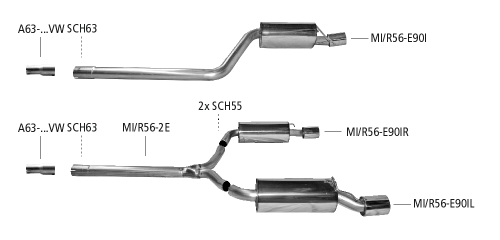 VW benötigt. Eine Verwendung der Endschalldämpfer LH+RH ist ebenfalls möglich. Zur Montage benötigt man neben den Endschalldämpfern MI/R56-90IL und MI/R56-90IR noch zusätzlich den Adapter A63-