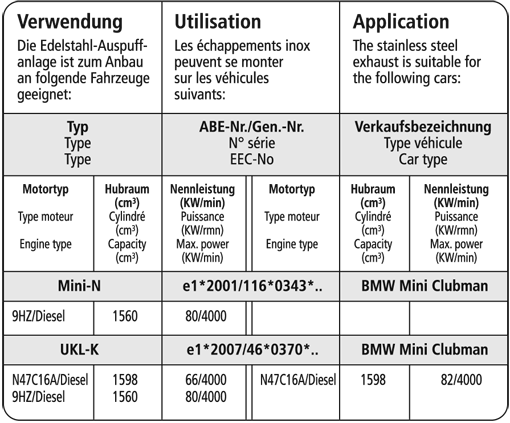 Bei Diesel Modellen können nur die Endschalldämpfer alleine montiert werden. Zur Montage des Endschalldämpfers mit 1x Endrohr RH, Art-Nr. MI/R56-E90I wird der Adapters A63-