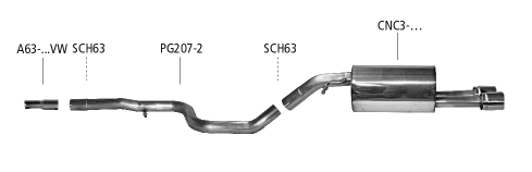 Bei Diesel Modellen kann nur der Endschalldämpfer alleine montiert werden. Zur Montage des Endschalldämpfers benötigt man neben dem Adapter A63-...VW zusätzlich das Verbindungsrohr PG207-2! Bei Montage des Double S Endschalldämpfers (CNC3-76T) muss die original Heckschürze ausgeschnitten werden.