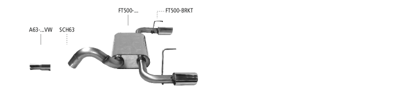 VW zusätzlich 1x den Halter FT500-BRKT und 1x den Aufhängegummi ROMI-G1. Es wird empfohlen bei Verwendung des Endschalldämpfers mit Einfach-Endrohr Ausgang LH+RH den Heckschürzenansatz FDKA/RU8-HE1 oder bei Verwendung des Endschalldämpfers mit Doppel-Endrohr Ausgang mittig den Heckschürzenansatz FDKA/RU8-HE2 mit zu verwenden.