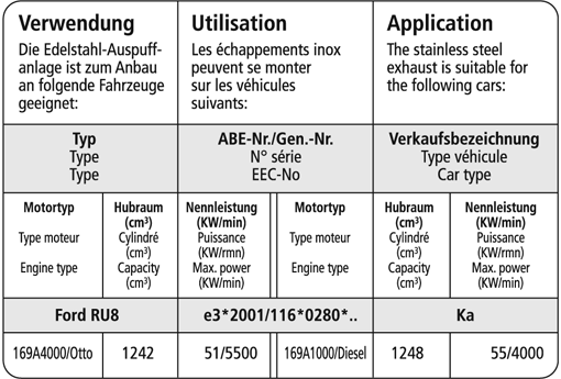 VW zusätzlich 1x den Halter FT500-BRKT und 1x den Aufhängegummi ROMI-G1. Es wird empfohlen bei Verwendung des Endschalldämpfers mit Einfach-Endrohr Ausgang LH+RH den Heckschürzenansatz FDKA/RU8-HE1 oder bei Verwendung des Endschalldämpfers mit Doppel-Endrohr Ausgang mittig den Heckschürzenansatz FDKA/RU8-HE2 mit zu verwenden.