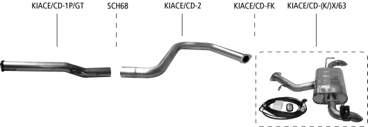 Die Endschalldämpfer können auch alleine montiert werden. Zur Montage benötigt man zusätzlich den Adapter A63-...VW, den Adapter KIACE/CD-AD und das Befestigungskit KIACE/CD-FK!