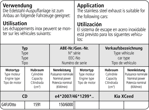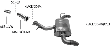 Die Endschalldämpfer können auch alleine montiert werden. Zur Montage benötigt man zusätzlich den Adapter A63-...VW, den Adapter KIACE/CD-AD und das Befestigungskit KIACE/CD-FK!