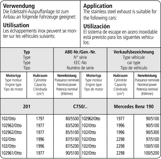 - 190 W201 2.6l für Fahrzeuge ohne Katalysator