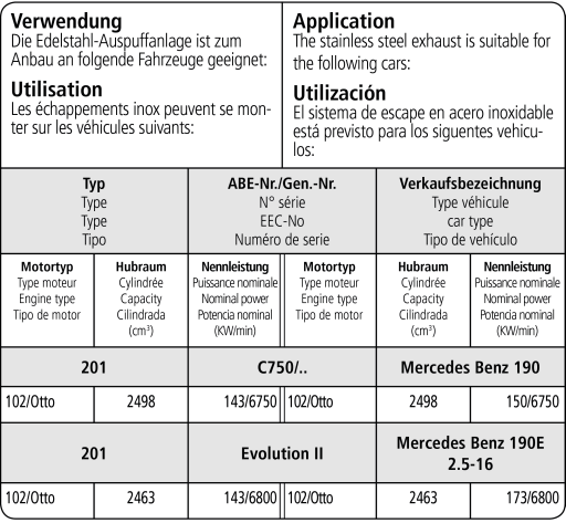 - 190 W201 2.3l 16V für Fahrzeuge mit Katalysator