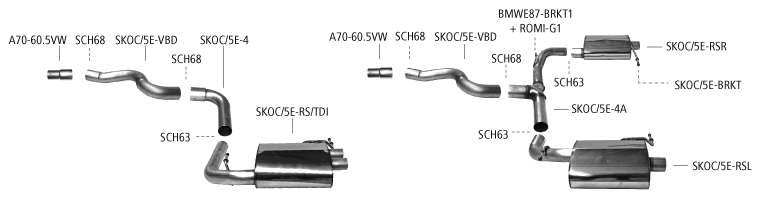 Bei Diesel Modellen können nur der Endschalldämpfer LH SKOC/5E-RS/TDI oder die Endschalldämpfer LH SKOC/5E-RSL und Endschalldämpfer RH SKOC/5E-RSR alleine montiert werden. Zur Montage der Endschalldämpfer LH+RH benötigt man neben dem Adapter A70-60.5VW, dem Verbindungsrohr vorne SKOC/5E-VBD und dem Y-Verbindungsrohr SKOC/5E-4A noch zusätzlich den Halter SKOC/5E-BRKT und den Halter BMWE87-BRKT1 +Aufhängegummi ROMI-G1 zur Montage des Endschalldämpfer RH. Zudem ist es erforderlich, die Auspuffblende RH SKOC/5E-RSR/BL anstelle der Original Auspuffblende zu montieren.