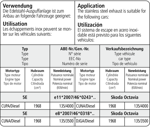 Bei Diesel Modellen können nur der Endschalldämpfer LH SKOC/5E-RS/TDI oder die Endschalldämpfer LH SKOC/5E-RSL und Endschalldämpfer RH SKOC/5E-RSR alleine montiert werden. Zur Montage der Endschalldämpfer LH+RH benötigt man neben dem Adapter A70-60.5VW, dem Verbindungsrohr vorne SKOC/5E-VBD und dem Y-Verbindungsrohr SKOC/5E-4A noch zusätzlich den Halter SKOC/5E-BRKT und den Halter BMWE87-BRKT1 +Aufhängegummi ROMI-G1 zur Montage des Endschalldämpfer RH. Zudem ist es erforderlich, die Auspuffblende RH SKOC/5E-RSR/BL anstelle der Original Auspuffblende zu montieren.