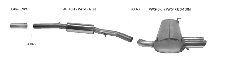 Eine Verwendung der Endschalldämpfer alleine ohne Vorschalldämpfer ist nicht möglich. Beim VW Golf 4 V6 (4Motion) ist bei Verwendung der Golf 4 R32 Anlage das Unterteil der Standard-Heckschürze (ohne Heckschürzenausschnitt) des VW Golf 4 zu verwenden und entsprechend auszuschneiden. Zur Montage der R32-Anlage benötigt man beim Golf 4 V6 (4 Motion) neben dem Adapter A70a-65.5LVW, den Vorschalldämpfer VWG4R32Q-1 und den Endschalldämpfer VWG4R32Q-100R. Eine Verwendung des Endschalldämpfers VWG4Q-76T ist beim VW Golf 4 R32 nicht möglich.