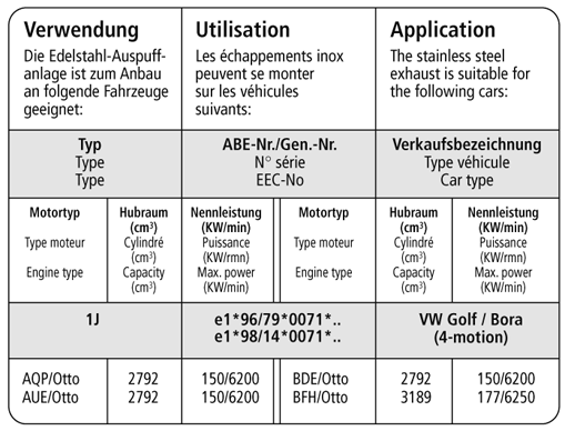 Eine Verwendung der Endschalldämpfer alleine ohne Vorschalldämpfer ist nicht möglich. Beim VW Golf 4 V6 (4Motion) ist bei Verwendung der Golf 4 R32 Anlage das Unterteil der Standard-Heckschürze (ohne Heckschürzenausschnitt) des VW Golf 4 zu verwenden und entsprechend auszuschneiden. Zur Montage der R32-Anlage benötigt man beim Golf 4 V6 (4 Motion) neben dem Adapter A70a-65.5LVW, den Vorschalldämpfer VWG4R32Q-1 und den Endschalldämpfer VWG4R32Q-100R. Eine Verwendung des Endschalldämpfers VWG4Q-76T ist beim VW Golf 4 R32 nicht möglich.