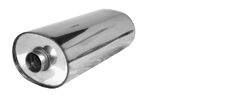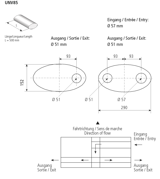 Universal-Schalldämpfer oval querliegend 290 x 152 mm, Länge 500 mm, Eingang 1 x Ø 51 mm, Ausgang 1 x Ø 51 mm 1 x Ø 57 mm