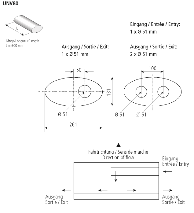Universal-Schalldämpfer oval querliegend 261 x 131 mm, Länge 600 mm, Eingang 1 x Ø 51 mm, Ausgang 2 x Ø 51 mm